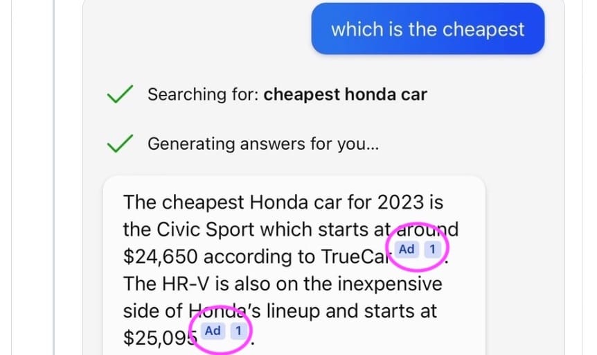 — Technically, it’s Microsoft’s Bing search engine —which is powered by the same tech that powers ChatGPT— that has started serving up ads.