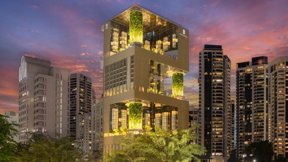 The soaring 23-story Pan Pacific Orchard, Singapore was designed by WOHA Architects and resembles “a tropical Jenga tower with 7,300 sqm of foliage across four cut-out terraces” (Business Traveller)