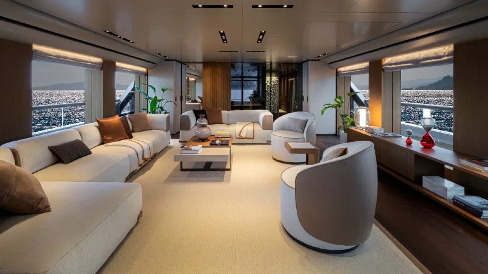 Owned by a serial boater who appreciates “the simple life,” a new hybrid yacht pairs chic, minimalist interiors with three galleys, two pools, and one of the largest top-deck terraces on any yacht of its size (Maurizio Paradisi / Robb Report)