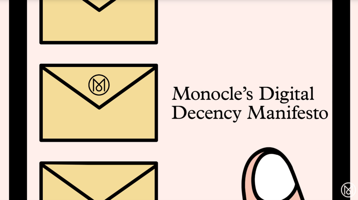 MONOCLE, TASTEFUL MONOCLE, has a “code of digital decency” that asks folks “to turn their phones to silent, and refrain from listening to video clips with the volume turned up.”