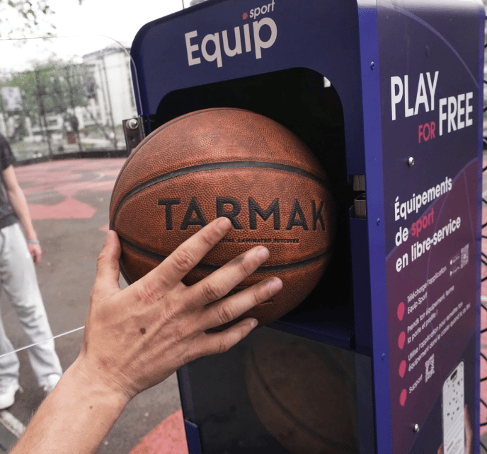 A free, self-service, sports equipment vending machine next to a basketball court on Paris’s canal Saint-Martin. “Le Basket” has never been more popular in France (AP)